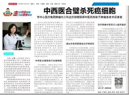 近年来,癌症发病率逐年增高,中医药在肿瘤综合治疗中的作用越来越被人们重视。但很多患者和家属对中医常常陷入两极误区,一种人认为中医只是安慰剂和调理身体的补药,起不到抗肿瘤的作用;另一种则把中医当成救命的神药,寄希望于“偏方”“神方”,甚至要求放弃化疗改喝中药汤剂。市中心医疗集团肿瘤内三科(中西医结合科)主任徐媺强调,中医药在肿瘤的综合治疗中发挥着不可忽视的作用,它有助于术后患者的康复,能起到预防复发、转移的作用。此外,中医药还可以减轻放疗、化疗引起的不良反应,在放疗、化疗结束后,仍可以长期服用,以调节身体的机能、改善微环境,从而提高远期生存率。