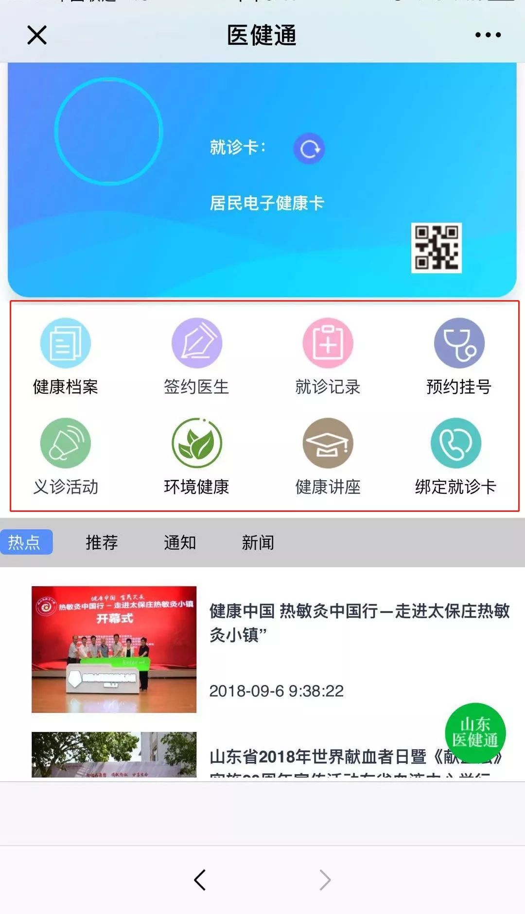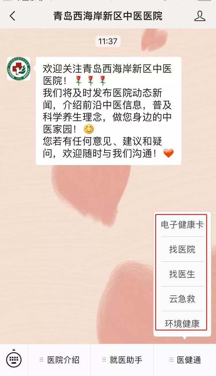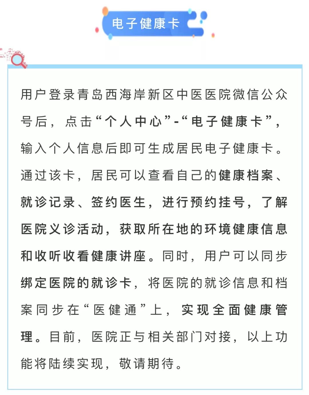 为深入贯彻落实省卫健委关于开展“互联网+医疗健康”便民惠民百日行动会议精神,提升医院医疗卫生服务水平,切实让群众感受到“互联网+医疗健康”创新成果带来的实惠,近日,青岛西海岸新区中医医院按照青岛市卫计委、西海岸新区卫健局的统一安排,实现了微信智慧平台成功对接“山东医健通”,重磅上线“电子健康卡”、“找医院”、“找医生”、“云急救”四大功能。