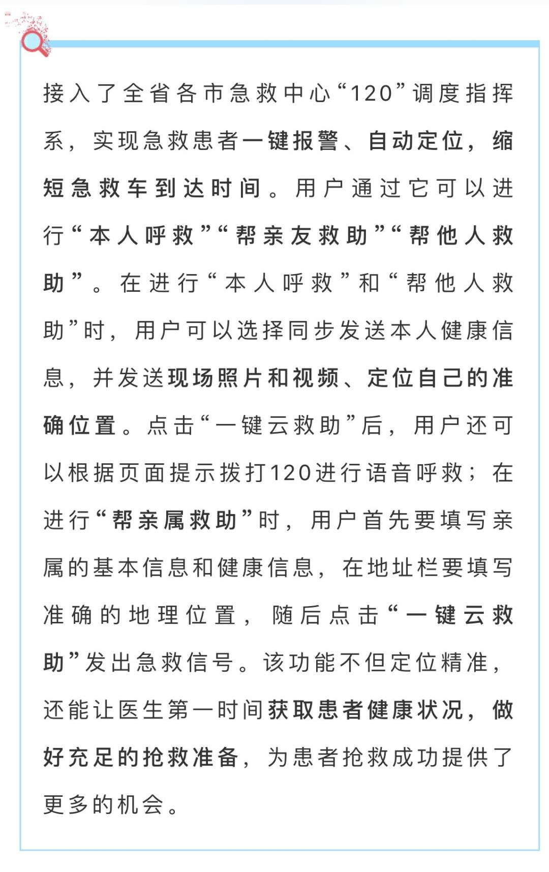“山东省医健通”利用“位置即服务”和“健康空间智能”等先进技术和理念,开放云诊室和云医院平台服务,为患者提供“找医院、找医生、预约挂号”等便捷服务,还可以实现医生与居民在线互动,进行健康咨询。云急救平台服务形成五屏联动的服务体系、精准定位,为抢救患者生命提供服务。