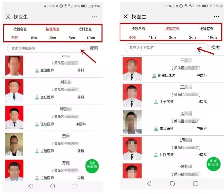 用户可以根据自己需要和距离,选择按姓名、按科室、按医院查询医生,并预约挂号或在线咨询。