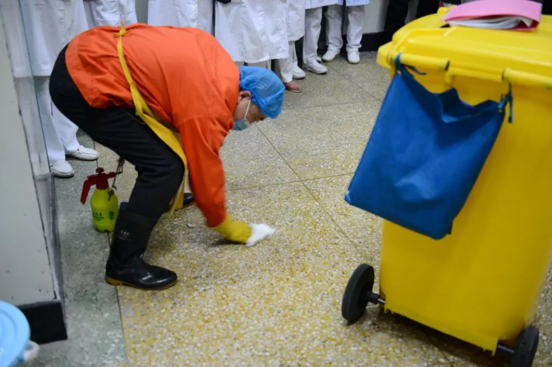 演练地点设置在开放病房,场景模拟一名医疗废物专职回收人员转运医疗废物至暂存点途中,不慎将医疗废物掉落在地,包装袋破裂,部分医疗废物洒落。保洁员立即电话通知后勤、安保、院感、开放病房等相关科室,相关人员在规定时间内赶赴现场。根据对泄露的医疗废物影响范围及严重程度等情况评估后,立即电话报告分管领导周晶副院长,启动医疗废物流失、泄露、扩散和意外事故发生应急预案。同时,安保科封锁现场,院感科指导转运医疗废物工作人员对洒落的医疗废物迅速进行收集、包装封口,对污染区域进行清洁、消毒。