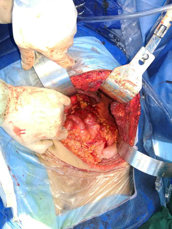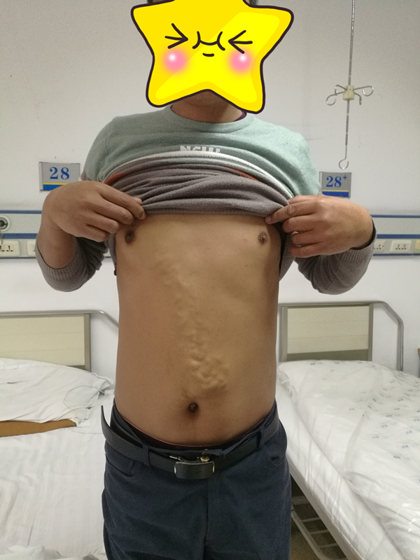 患者出生于胶州贫困农村家庭,自幼丧父,母子俩相依为命,因自己一直体弱多病至今未婚。出生后发现腹壁静脉曲张、且随年龄增加而逐渐加重,少年时即开始反复出现上消化道出血,每1-2年发生一次、共约10余次,多次住院治疗,医药花费巨大、家庭经济状况非常拮据。数十年来曾无数次奔走岛城、省内外多家三级甲等大型综合医院知名肝胆外科专家求医无果,皆因病情太重、肝硬化原因不明、肝功能太差、属于肝硬化失代偿,腹腔内血管异常怒张,尤其是凝血机制异常差(其凝血酶原活动度仅38%、血小板40x109/L、纤维蛋白原1g/L)等原因未给予手术治疗。患者之所以选择青岛六医,慕名而来选择肝胆外科刁同进教授手术,是因为他医术精湛、医德高尚。虽历经手术巨大风险及术后严重并发症“肝硬化腹水、原发性腹膜炎”等多个巨大难关,但六医肝胆外科给予及早明确诊断、及时处理精准得当。围手术期在其医护团队的精心治疗、无微不至的悉心呵护下得以顺利康复出院,患者及家属对青岛六医肝胆外科、手术室麻醉科、ICU及十病区医护团队的高尚医德和精湛技术给予高度评价。