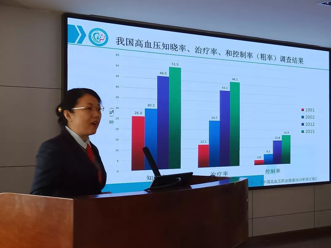 高血压是世界最常见的心血管疾病,我国人群高血压的患病率仍呈升高趋势。为了更好的帮助医生、药师规范使用降压药物,2019年1月24日,杨晓秋总药师为医院及健共体成员单位临床医师、药师共计120人进行了专题培训,杨晓秋总药师再次讲授高血压药物的临床合理应用,指导医生在不同血压水平、不同高血压并发症情况下,恰当、合理、规范的使用降压药物,提高自身的药物治疗水平,使高血压患者的治疗依从性和持续性有所改善,提高高血压控制率,减少心脑血管事件。杨晓秋总药师在培训中就高血压药物的分类与作用机制、高血压药物在特殊人群中的合理使用及案例分析等内容进行了耐心细致地讲解。