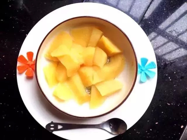 将苹果带皮切成小片,放入小碗中,隔水蒸5分钟即可,稍稍冷却后,即可食用。