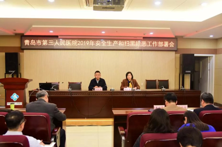 1月31日下午,青岛市第三人民医院召开2019年度安全生产和“扫黑除恶”专项斗争工作部署会,并签订安全生产工作目标责任书,医院领导班子、中层干部及护士长参加了会议。