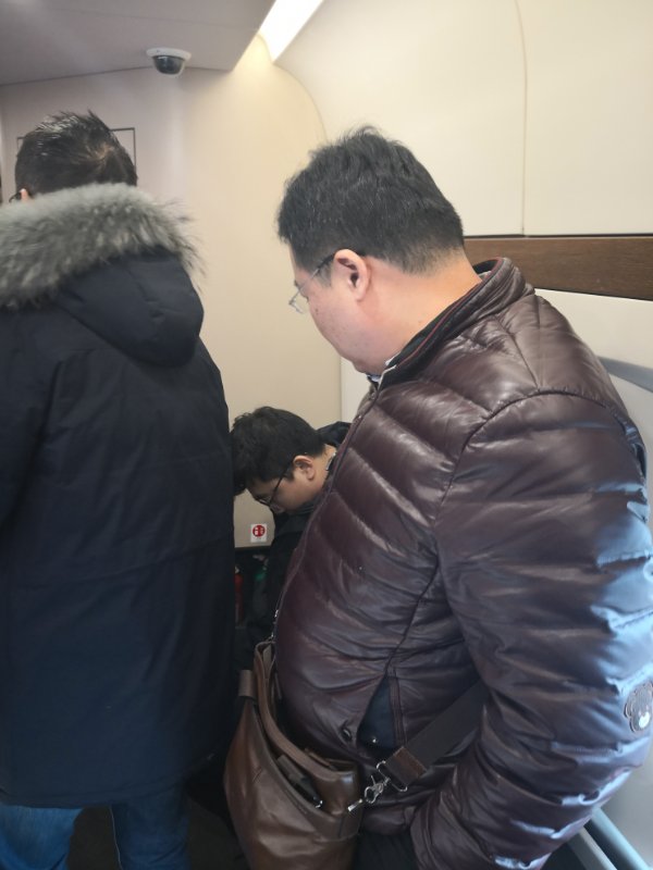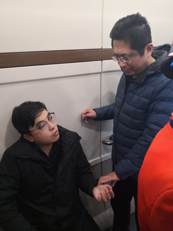 当时正值春节返程高峰,又是中午饭时间,车内人多拥挤,况磊迅速穿过三节车厢来到病人身边,此时离着9车厢较近的尹鹏医生已经来到病人身边,他看到一位30岁左右的男乘客,面色苍白,头冒虚汗。尹鹏医生协助乘务员将病人扶至较宽敞的地方,此时赶到的况磊医生对乘务员说:“我们是胶州市人民医院的医生,让我来看一下病人”接着问“火车上有体温表吗?”乘务员拿了体温表,量体温的同时,况磊对患者进行了号脉及病情询问检查,体温37.8摄氏度,心率正常,头晕半小时,冒虚汗,但是病人无视物模糊,无恶心呕吐,考虑普通感冒,嘱多饮水,注意休息。由于病人没有家属陪同,尹鹏医生及况磊医生在旁边又守候了半个小时的时间,确认此乘客的病情稳定后,才起身准备离开,临走时又叮嘱患者到站后的相关注意事项,吃哪一类的药,然后才各自回到座位。