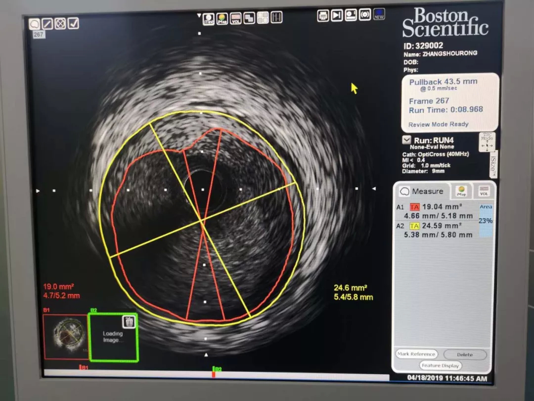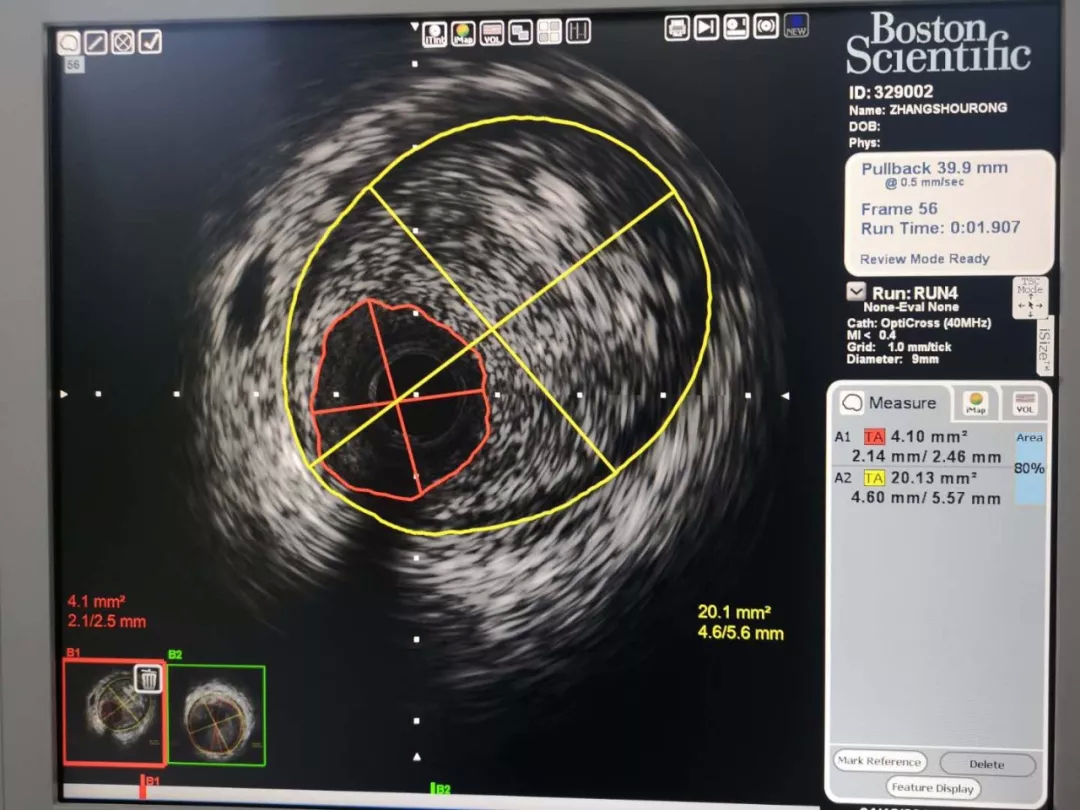 经图像分析后诊断患者斑块为纤维化混合脂质斑块,测量病变血管最大直径5.57mm,最小管腔直径2.14mm,狭窄达80%。因无该尺寸支架,建议患者选择冠脉搭桥治疗。