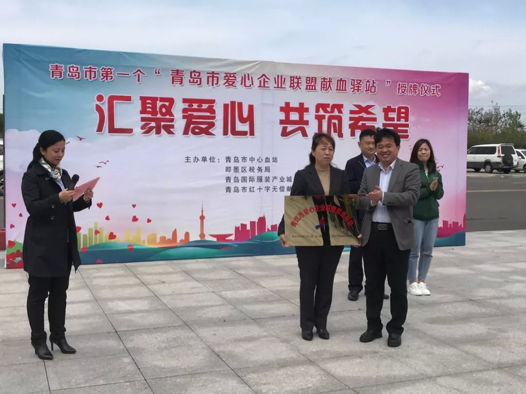 传递热血真情,浇开生命之花;汇聚公益力量,点亮生命之光。在这个春暖花开、生机盎然的美好时节,4月28日,由青岛市中心血站、青岛市即墨区税务局、胶州市税务局联合主办的第一批“青岛市爱心企业联盟献血驿站”授牌仪式暨“税企携手献热血 减税降费促发展”活动,在青岛国际服装产业城、锋泾(中国)建材集团有限公司、青岛仁河盛钢材销售公司同时举办。126名爱心人士积极报名献血,经严格体检,共有103名爱心人士成功献血33400毫升。