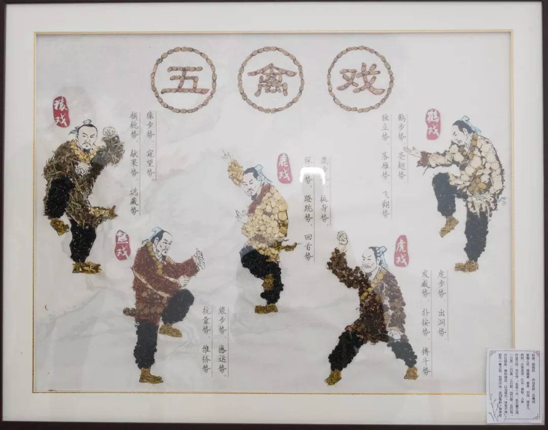 作品寓意:五禽戏由东汉名医华佗模仿虎、鹿、熊、猿、鸟 5种动物的动作创编的气功。分别仿效虎之威猛、鹿之安舒、熊之沉稳、猿之灵巧、鸟之轻捷,力求蕴涵“五禽”的神韵。经方出处:张仲景《伤寒论》小青龙汤。伤寒心下有水气,小青龙汤主之,主治水饮病相关证治,如咳逆、水肿、喘憋等,是临床常用有效经方名方,在肺病科用于肺胀等属外寒内饮证者。经方组成:麻黄、芍药、细辛、炙甘草、干姜、桂枝、五味子、半夏。