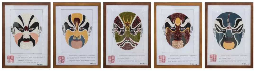 作品寓意:中医自古以来就有“药食同源”理论。许多食物既是食物也是药物,同样能够防治疾病。《内经》曾指出;疾病除药物治疗外,应该“谷肉果菜,食养尽之。”食疗可以排内邪、安脏腑、清神志、资血气。上有五行,下有五脏,五脏对五色,分别是红黄青白黑。京剧脸谱的五种颜色与五脏之主色相对应,是其主要色调。作品选取粳米、小米、绿豆、赤小豆、黑芝麻、枸杞、青黛、赤石脂等食材与药材,制作传统京剧脸谱5副,遥相呼应,传承中医与京剧国粹,生动诠释食药同源理念。