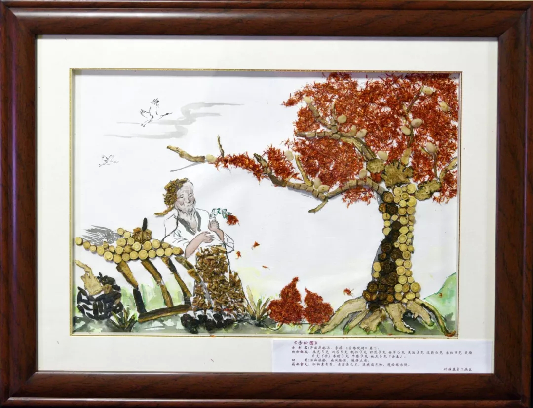 作品寓意:松柏素青苍,老翁赤之亢。松柏,比喻为人,本来是青绿色的,中医青主痛,不通。华佗的医术精湛和高洁的情操让它转变成了红色,红为红润,健康之意。逐瘀痛尽除,通经络亦强。经方出处:《医林改错》卷 身痛逐瘀汤。方剂组成:秦艽、川芎、桃仁、红花、甘草、羌活、没药、当归、灵脂、香附3克、牛膝、地龙。功效:活血祛瘀,祛风除湿,通痹止痛。