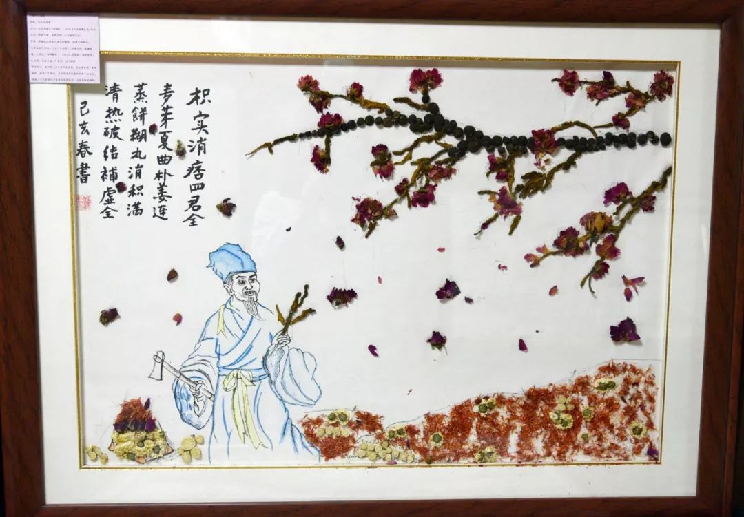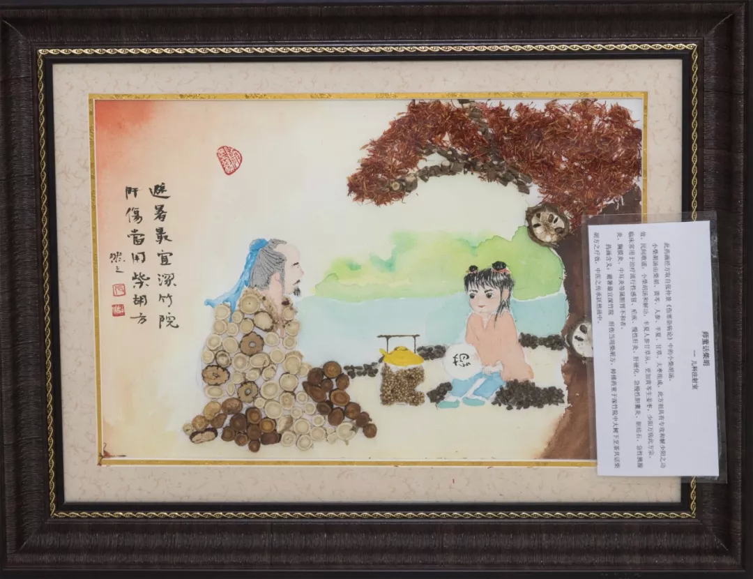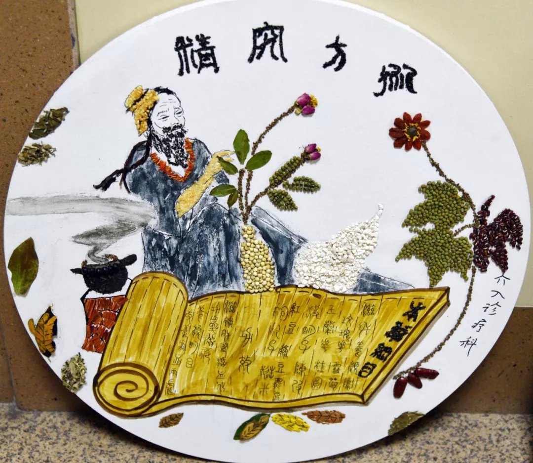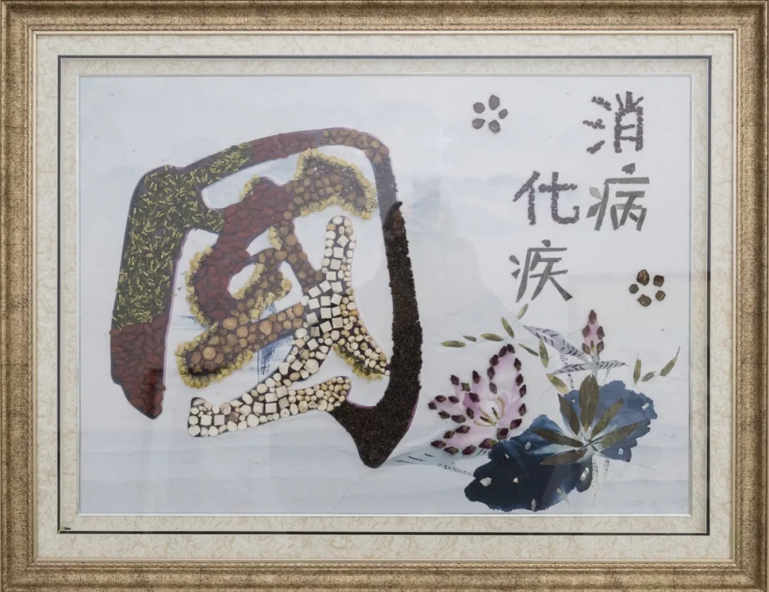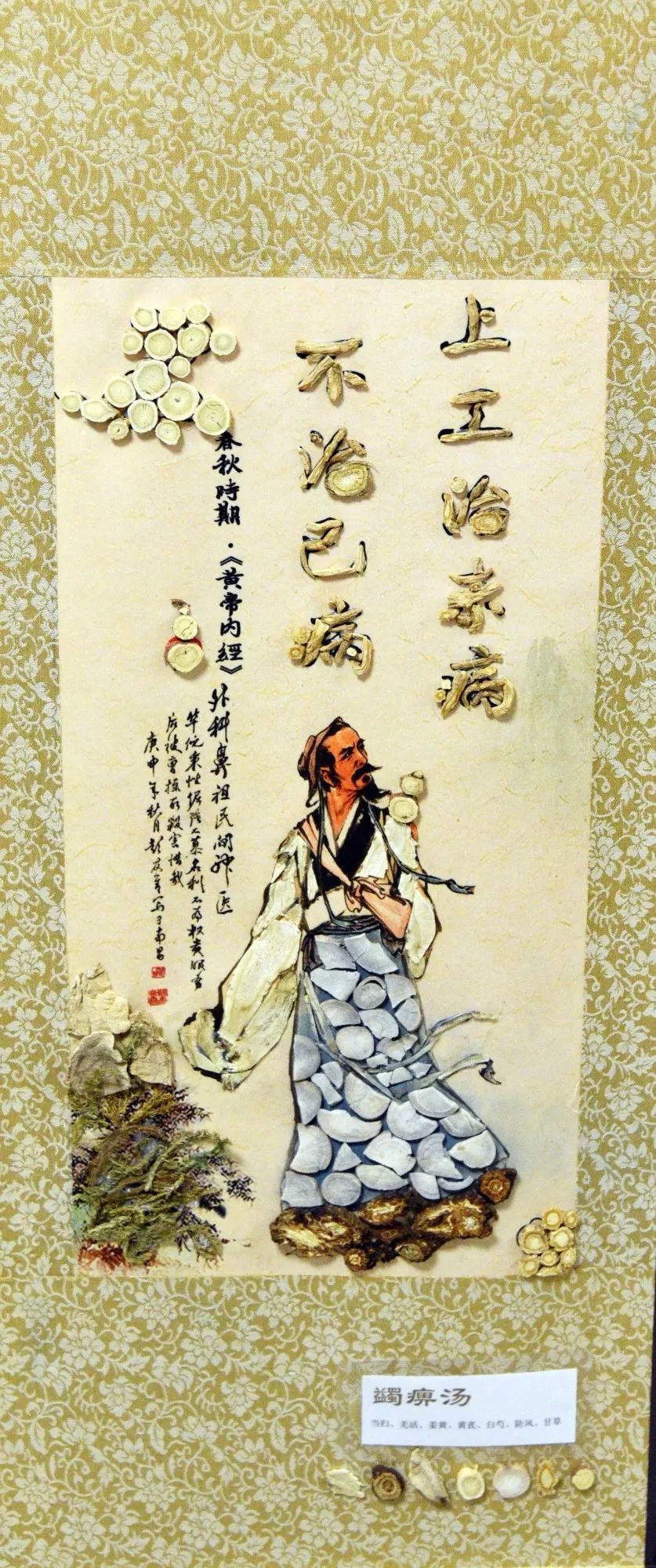 作品寓意:唐朝名医孙思邈提出:“上工治未病之病、中工治欲病之病、下工治已病之病”。使用蠲痹汤原料黏贴了一幅上工图,这位上工亦为华佗、亦为孙思邈、亦为李时珍,寓意着古代名医的技术和中医文化源远流长。经方出处:宋朝《杨氏家藏方》蠲痹汤组方。主要有当归、羌活、姜黄、黄芪、白芍、防风、甘草。此方治疗风湿热、类风湿关节炎、骨关节炎等病,均属中医“痹证”范畴,本方有益气活血之功,气通则血活,血活则痹散。