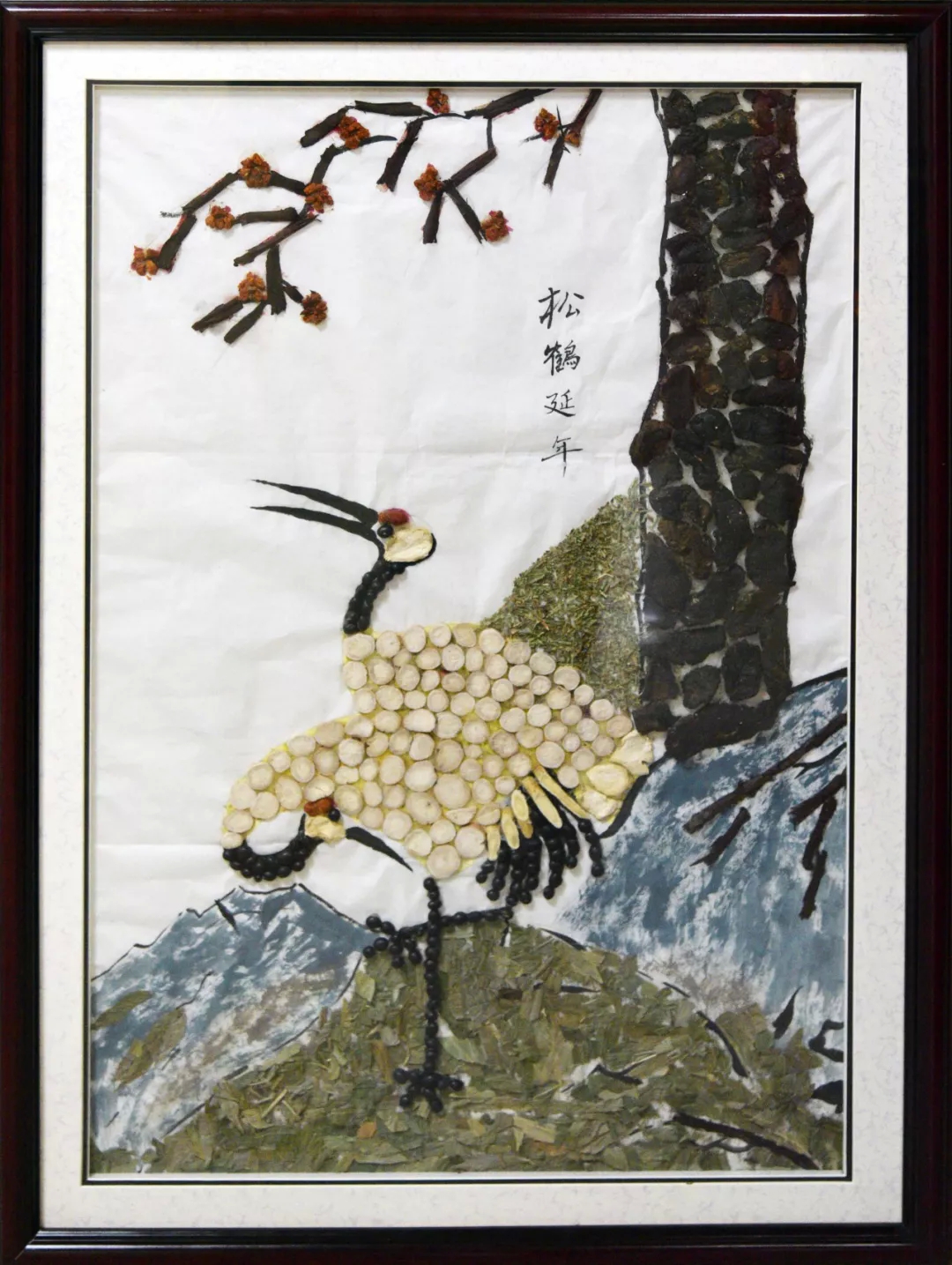 作品寓意:希望广大患者能够像松像鹤一样,顽强的对待疾病,历经磨难,远离病痛,健康长寿!松由生地、栀子、紫草组成;鹤由栀子、白芍、甘草组成。