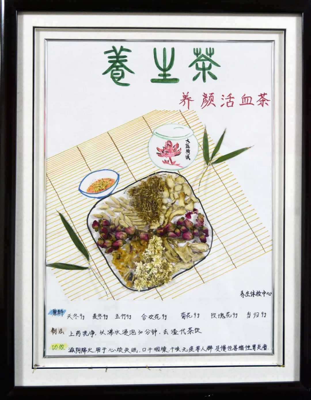 作品寓意:养生体检中心根据时令季节、不同药材配置养生茶,并适时更换,宣传中医养生和治未病理念,正可谓:养生茶饮不可少,修身养性品味高;时令体质很重要,辨证施用不能少;性味归经搞清楚,药效用途要知晓;春花夏绿秋乌龙,冬日寒袭宜品红;茶香悠远思陆羽,茗分四季善养生。经方出处:药画经方取自叶天士《温病条辨》中的益胃汤。方剂组成药材名称:麦冬、生地、玉竹玫瑰、菊花、合欢花、当归。