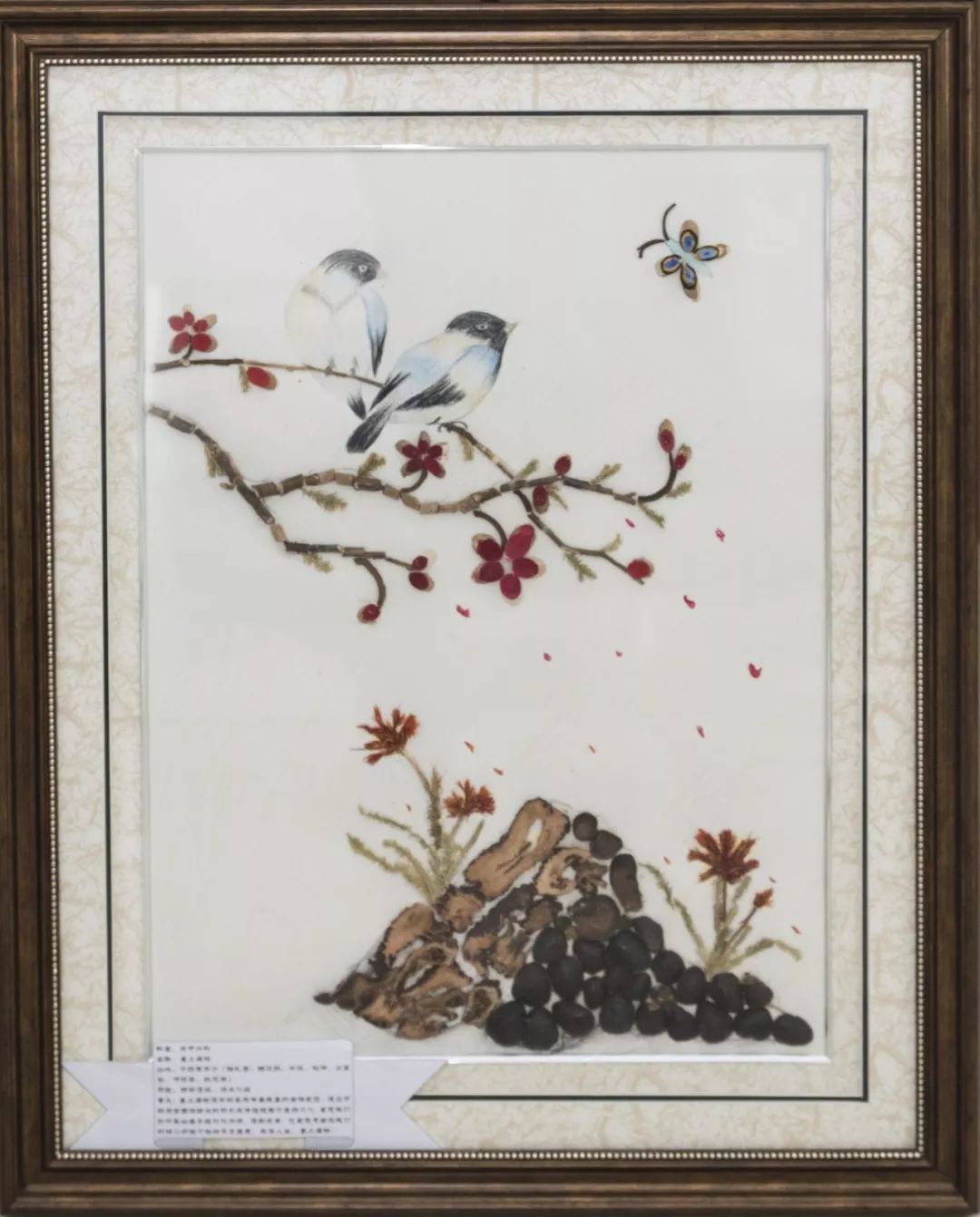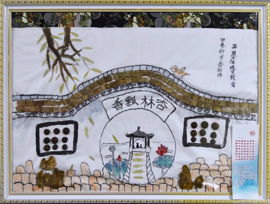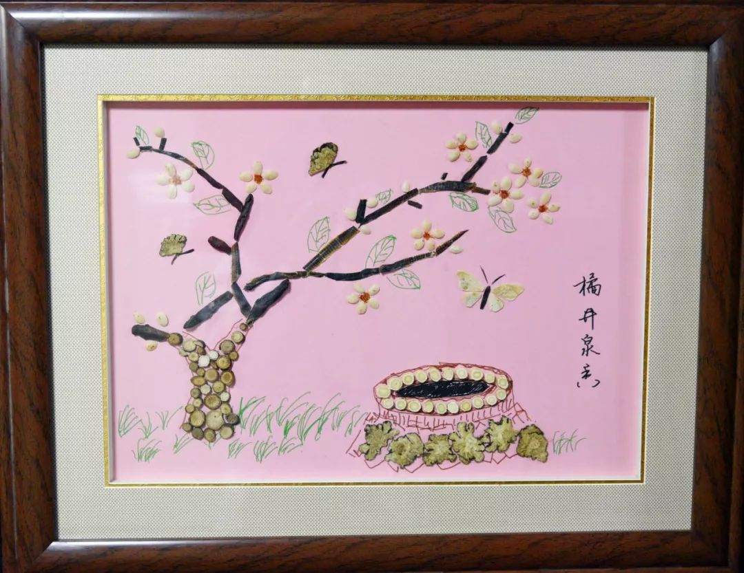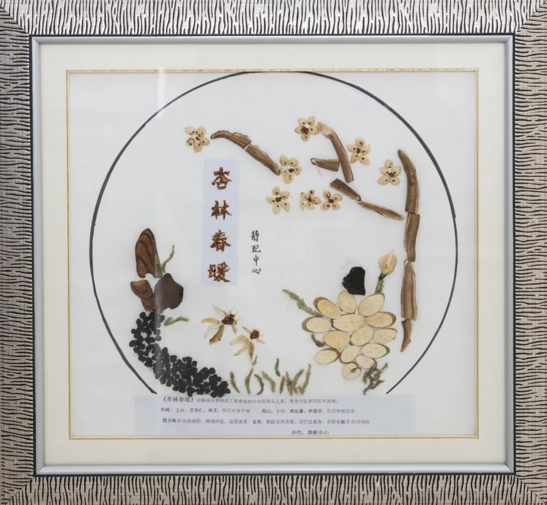作品寓意:主要描述了一幅春意盎然的杏压枝头之景。杏林春暖用来赞美行医者的医术高明。杏树中的苦杏仁具有止咳平喘、润肠通便之效,林芝具有止咳、平喘、保肝解毒抗衰老的作用;图中左侧是一座假山,假山的一部分没在水中,几株水草隐隐约约,假山部分主要是由鸡血藤和伸筋草所制,鸡血藤和伸筋草皆有伸筋活络之效。池中星星点点的淤泥是醋五味子,具有收敛固涩以及益气生津等多种功效。图正中:金鱼眼睛—川贝母,金鱼尾巴—百合,金鱼身躯—栀子,是一味很好的止咳良方。