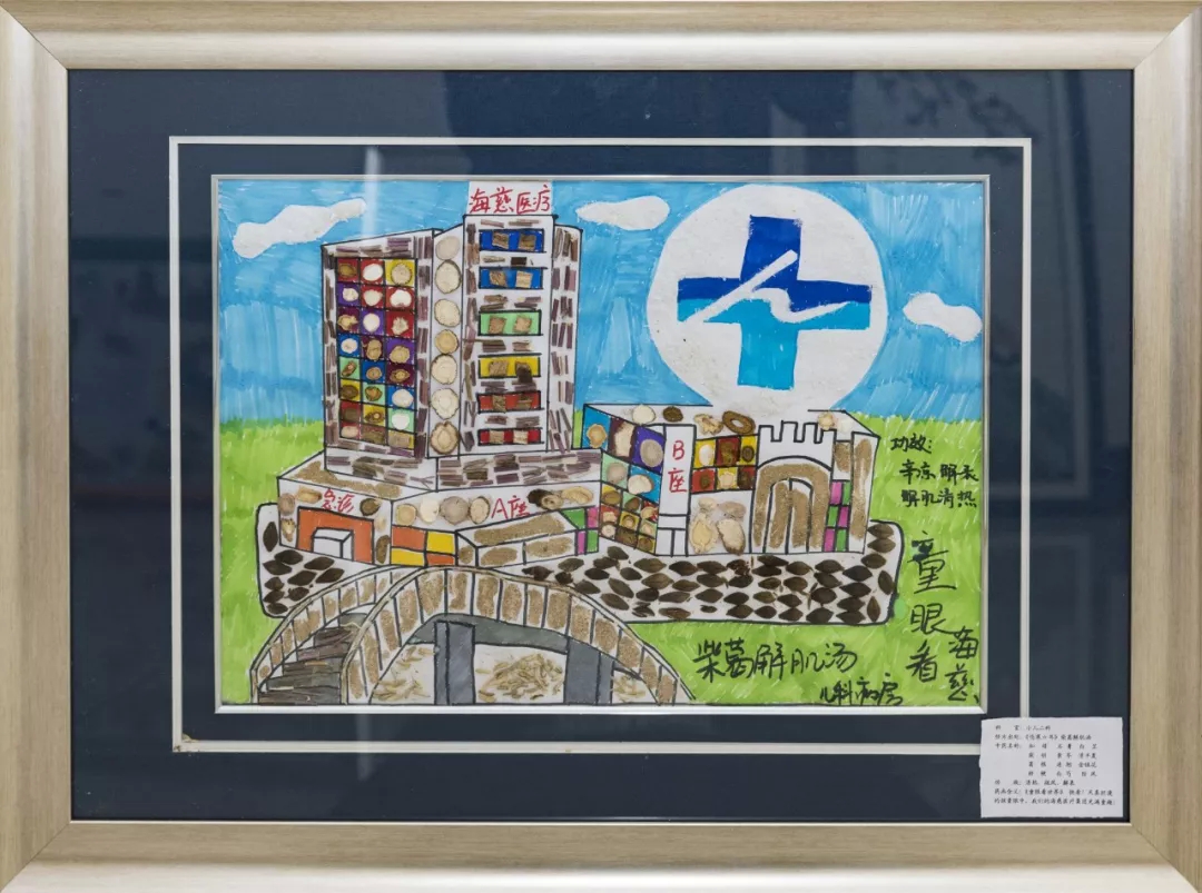 作品寓意:用孩子们无序的手法,来表达孩子们用眼睛看到的窗外世界,及阳光透过窗户照进病房的色彩斑斓。他们眼中的医院和病房,不只是白色、恐惧、疼痛,还有彩色,温暖和笑脸。经方出处:明代医学家陶华《伤寒六书》“柴葛解肌汤”。方剂组成:金银花、知母、石膏、柴胡、甘草、黄芩、桔梗、羌活、白芷、白芍、荆芥、葛根、连翘、薄荷等。