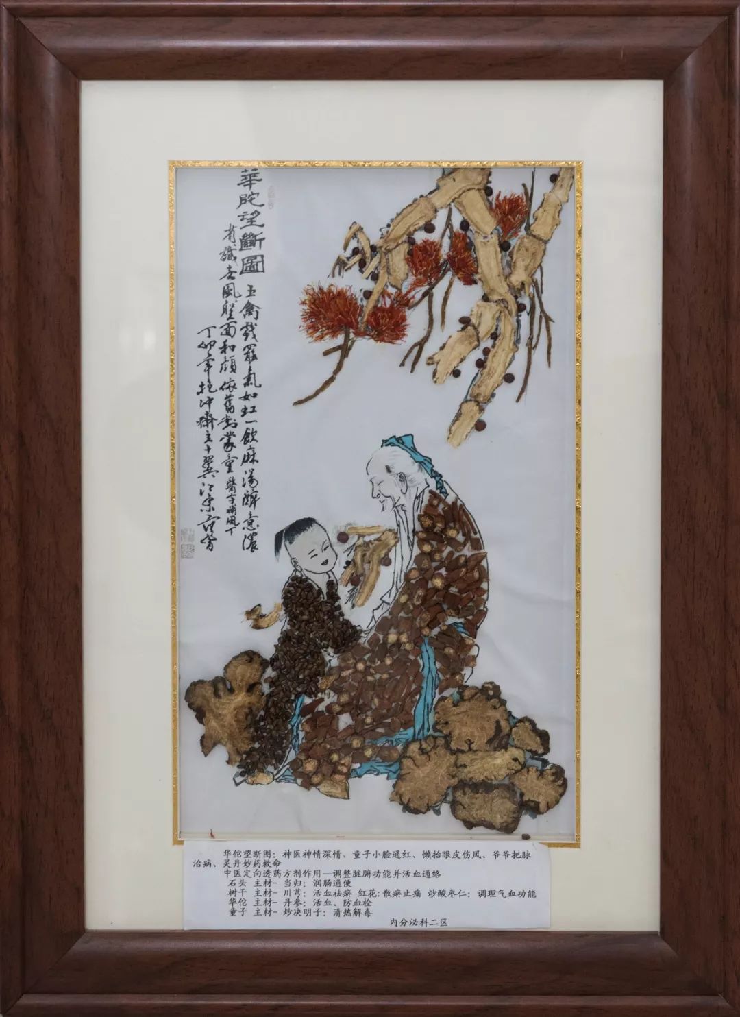 作品寓意:华佗首创“望、闻、问、切”,创“五禽戏”健身拳法,强调应加强体育锻炼,以增强体质;首创麻醉之术,是我国家喻户晓的名医。作品采用科室中医定向透药方剂中的六味中药材粘贴制成。药材功效:当归:常用于血虚萎黄、眩晕心悸、具有活血化淤、增强免疫力。红花:活血通经,散瘀止痛,增加冠脉血流量,促进血液循环。川芎:活血祛瘀,祛风止痛。炒酸枣仁:宁心安神、治疗虚烦不眠、烦渴虚汗、镇静和催眠。炒决明子:帮助睡眠,以及有防止视力模糊,降血压。丹参:具有养血安神活血化淤。