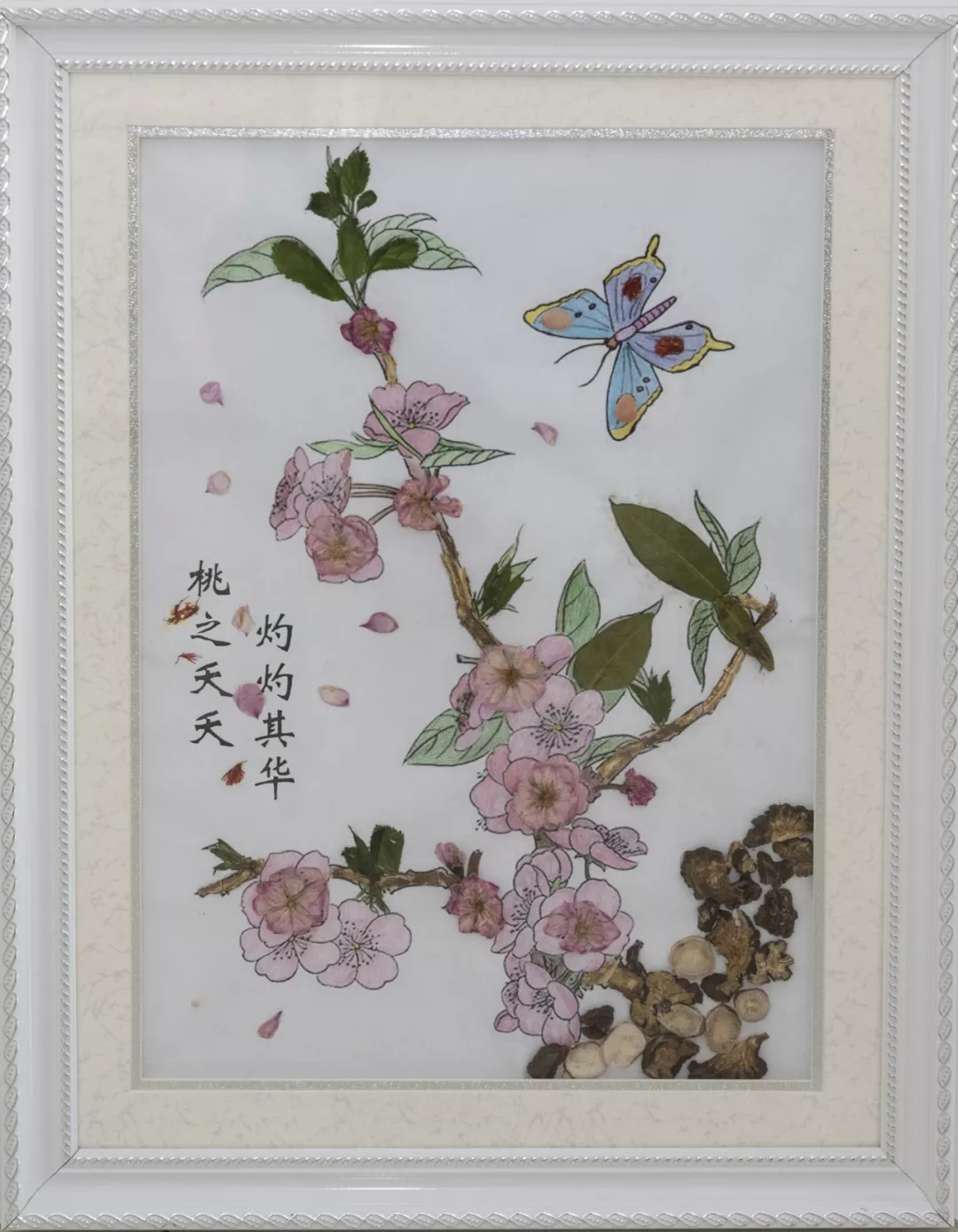 作品寓意:作品灵感来源于《诗经.周南.国风》的<桃夭>一篇,以桃花之美寓意护士内外兼修的美好形象。经方出自《玉机微义》转引的《医垒元戎》加味四物汤。使用白芍、当归、川芎、熟地组成了桃树,用桃仁、红花组成了蝴蝶。此方以祛瘀为核心,辅以养血、行气。桃仁、红花主活血化瘀;熟地、当归滋阴补肝;芍药养血和营;川芎活血行气。全方配伍得当,可应用于心悸、胸痹,头痛、眩晕等血虚兼血瘀证患者。