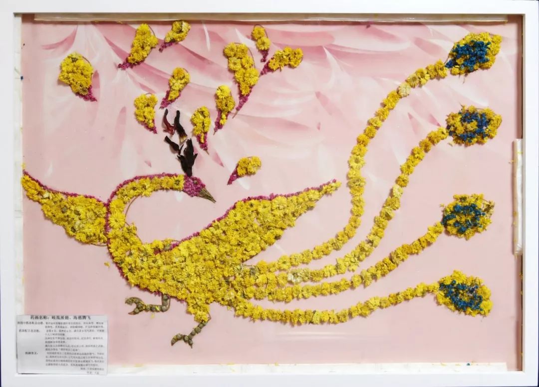 作品寓意:中医被称为“歧黄之术”;凰,亦作“凤皇”,古代传说中的百鸟之王。常用来象征祥瑞,是吉祥和谐的象征。取其两者谐音来喻意祥瑞吉兆,也借用此意来祝愿海慈医疗事业长久兴盛,华贵进取,祝愿海慈护理事业,每次付出都取得更多的收获,有凤凰展翅出碧空的惊叹!经方出处:《慈禧光绪医方选议》,方剂组成:菊花、洛神花、满天星。此方得名“清肝明目三花茶”,功效:降压滋阴,散风清热,平肝明目,化痰止咳,清热利尿。