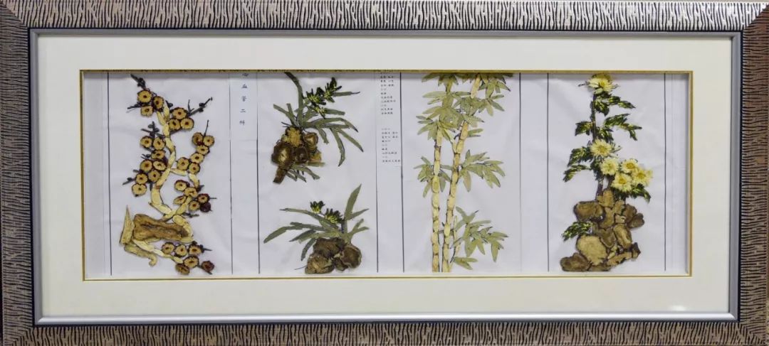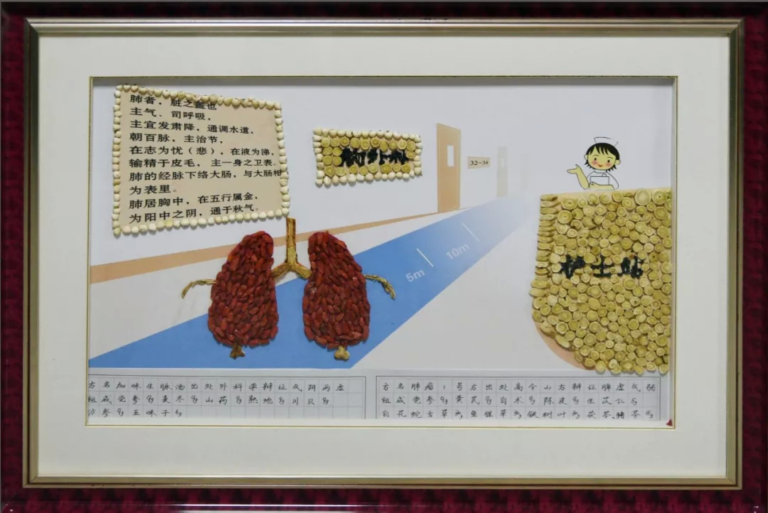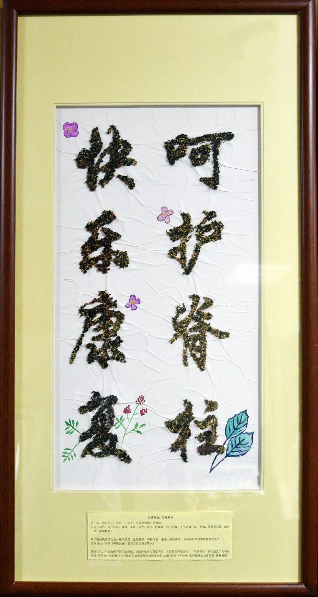作品寓意: 脊柱外科全体医务人员希望每一位就诊患者都能得到精心的治疗和护理,迅速恢复健康,快乐康复。经方出处:明朝《韩氏医通•卷下 方绝无隐章第八》方剂组成:“四子散”由紫苏子、莱菔子、白芥子、吴茱萸四味药共同组成。作品以四子散粘贴而成,点缀莱菔子花、吴茱萸果实、紫苏叶增加观赏性。