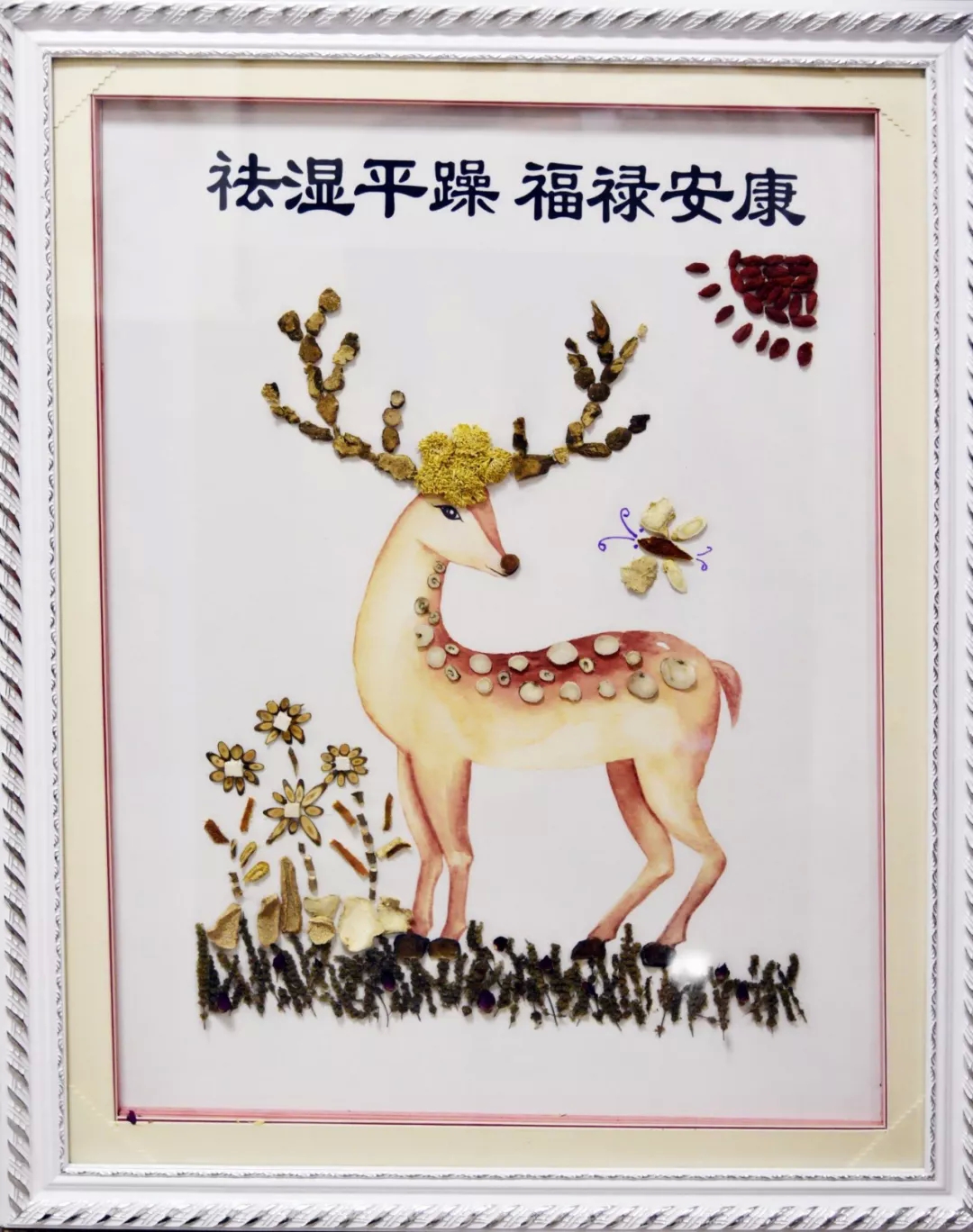 作品寓意:祛湿:“祛”乃祛除、消除;“湿”从字面上看与水有关,引伸至消毒供应中心之工作范畴;清洗、消毒、灭菌,清洗医疗器械上污渍,去除治病微生物,使其达到无害化状态。平躁:“矜平躁释”指心平气和,有涵养。福禄:“梅花鹿”是吉祥物的代表,寓意富裕、长寿。安康:患者安全、康复。