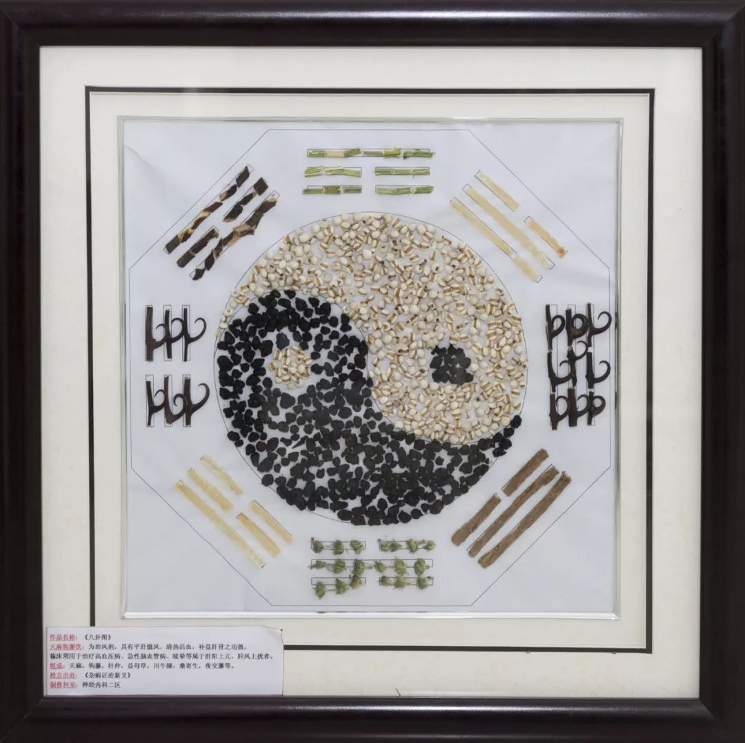 作品寓意:八卦,是中国古老文化,是一套用三组阴阳组成的哲学符号,用以解释自然、社会现象。乾代表天,坤代表地,巽代表风,震代表雷,坎代表水,离代表火,艮代表山,兑代表泽。经方出处:《杂病证治新义》天麻钩藤饮。此方为治风剂,具有平肝熄风,清热活血,补益肝肾之功效。主治肝阳偏亢,肝风上扰证。头痛,眩晕,失眠多梦,或口苦面红,舌红苔黄,脉弦或数。临床常用于治疗高血压病、急性脑血管病、内耳性眩晕等属于肝阳上亢,肝风上扰者。