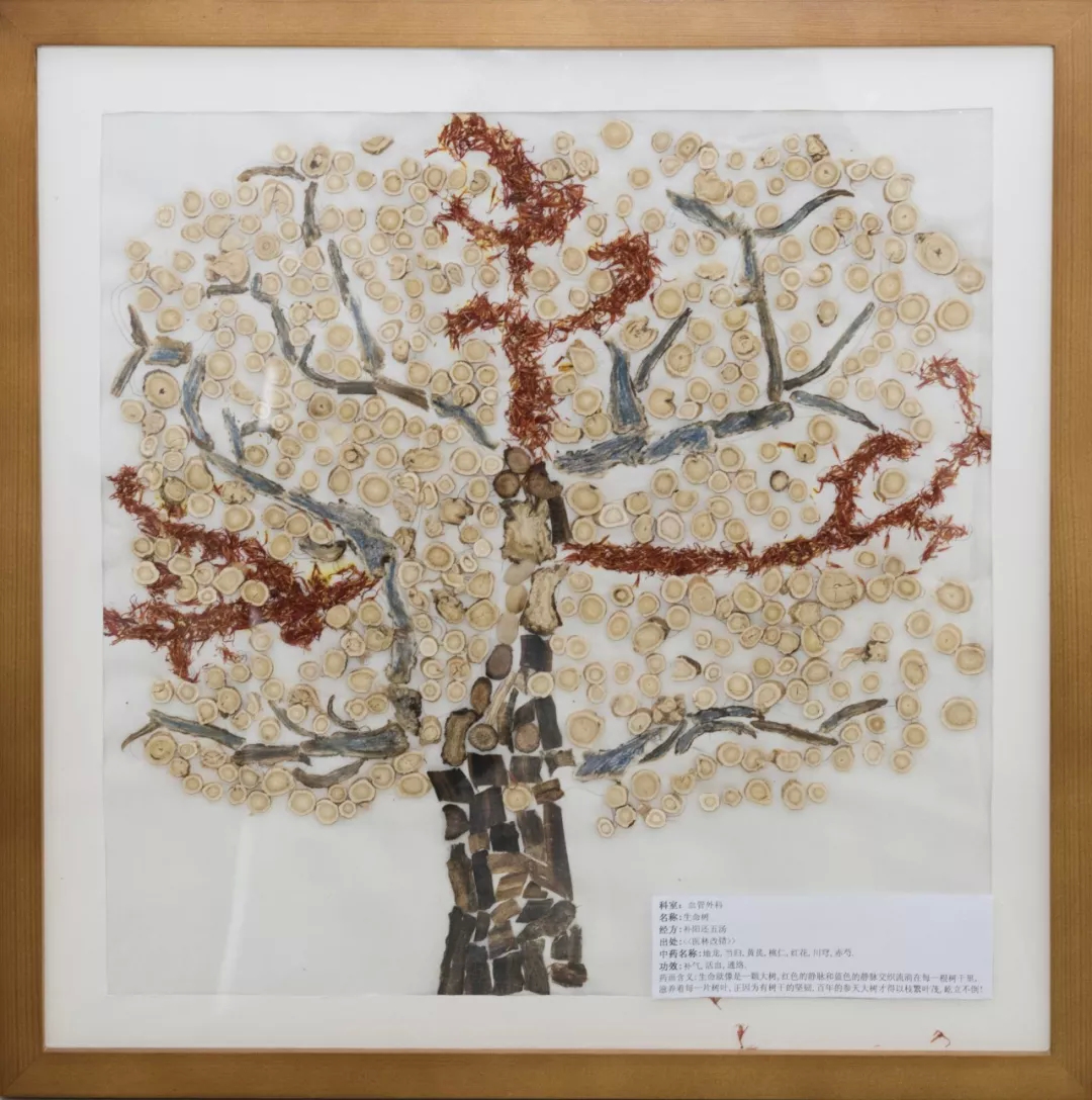 作品寓意:生命就像是一棵大树,而血管就是它的枝干,支撑着茂密的树冠,红色的动脉和蓝色的静脉交织流淌在每一根树干里,滋养着每一片树叶。枝干挺拔而笔直,直指蓝天,枝条柔软而有弹性,正因为有树干的坚韧,百年的参天大树才得以枝繁叶茂、屹立不倒!经方出处:《医林改错》补阳还五汤。方剂组成:地龙、当归、黄芪、桃仁、红花、川穹、赤芍。功效:补气、活血、通络。