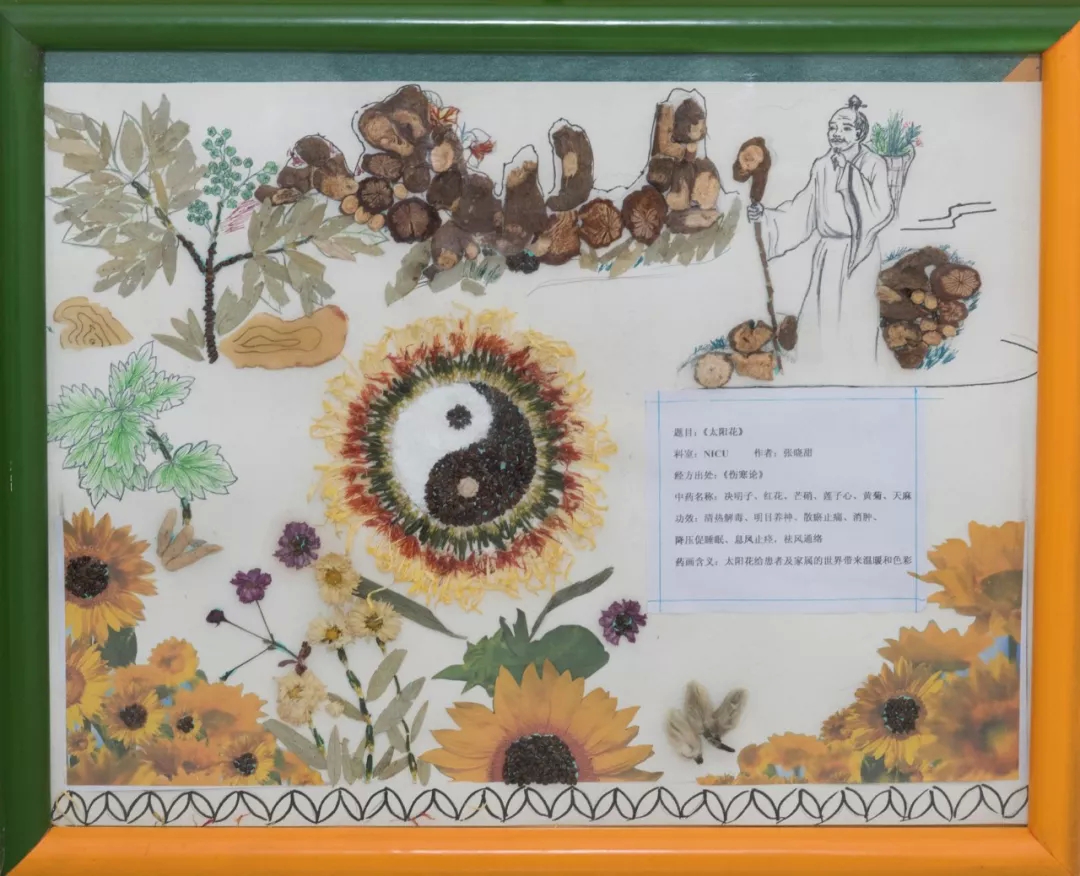 作品寓意:太阳花既是向日葵,又名望日莲;“更无柳絮因风起,惟有葵花向日倾”,这向往光明之花,给人们带来美好的希望。作品中老医者跋山涉水采药,体现中医文化博大精深,源远流长。几代中医人不断总结,得出一套独具特色的治疗和养生方法。经方出处《中医内科杂病证治新义》。药材方剂组成:天麻、石决明、黄芩、杜仲、皇菊、红花、莲子心等。