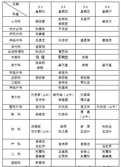 五一小长假期间专家门诊坐诊表