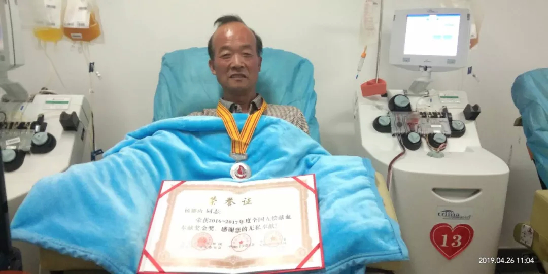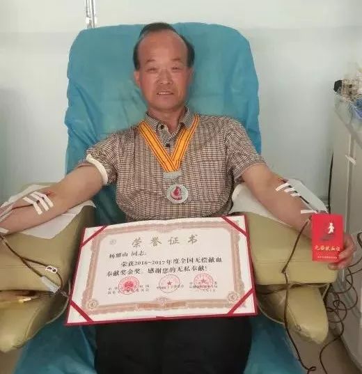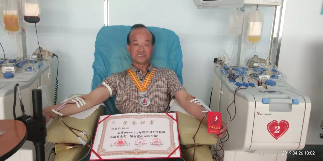 杨耀山是河南省项城市新桥镇的一位农民,也是一名非常忠诚的单采血小板献血者。1997年,他在厦门打工时无意间发现了一个献血屋,满怀好奇他走了进去,经过详细的了解,他有了一次不错的献血体验。之后,他在河南省红十字血液中心献过81次血,在周口市献过83次血,在武汉市血液中心献过3次血。通过献血,他获得了认可与尊重,自身价值得到了体现;通过献血,他认识了很多有爱心的朋友,收获了很多的快乐。