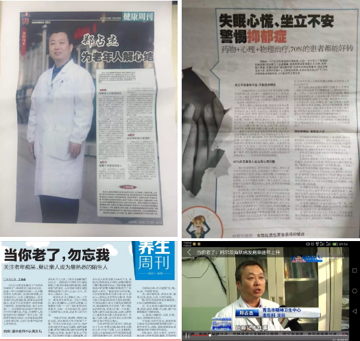 同时,为适时满足人民群众对心理卫生的服务需求,科室长期坚持开展基层巡讲和医疗扶贫活动,为实现优势资源配置的基层化和公益化做出了积极贡献,与青岛电视台等媒体合作,进行“国际阿尔茨海默日”科普宣传;与青岛狮子会、青岛广播电台等合作,开展老年失智患者的公益活动。近20年,科室培养了一大优秀骨干人才,连续多年派科室骨干人员在基层社区从事心理诊疗,利用周末休息时间深入社区和学校进行心理科普宣讲,受益人数达万余人次,为提高大众的心理健康水平,减少精神疾病、心理疾病的发生做出了突出贡献。