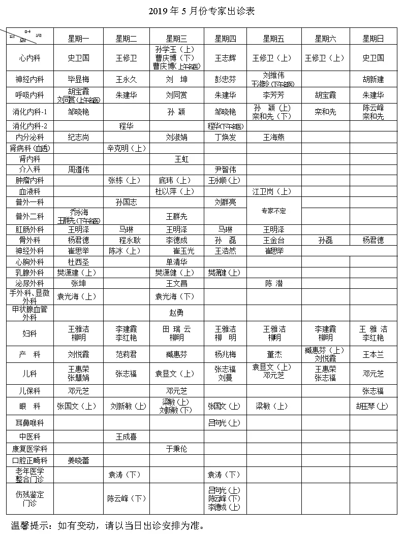 【温馨提示】青岛市第八人民医院2019年5月专家出诊表
