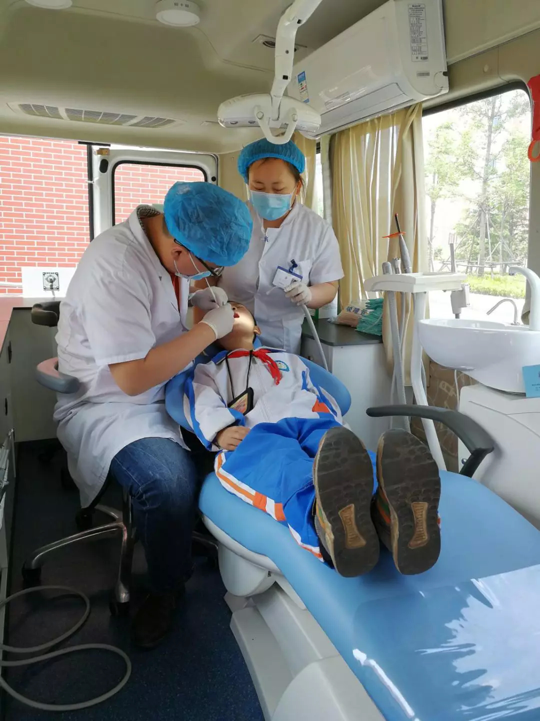 2018年西海岸新区中心医院还承担了西区4所学校800多名学生的窝沟封闭项目,由于学校距离医院远,跨区实施难度大,儿牙医生们积极拓宽思路、多方联系沟通,将移动口腔诊疗车开进校园,既节省来回接送学生的时间又不影响学校教学,更为重要的是确保了孩子们的安全。