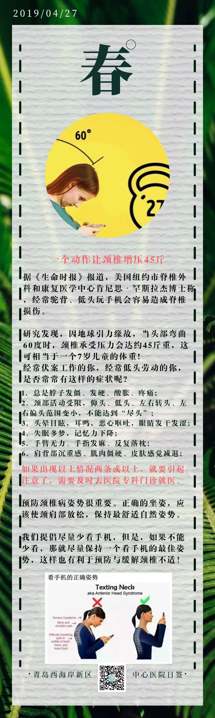 西海岸新区中心医院:日签 | 一个动作让颈椎增压45斤