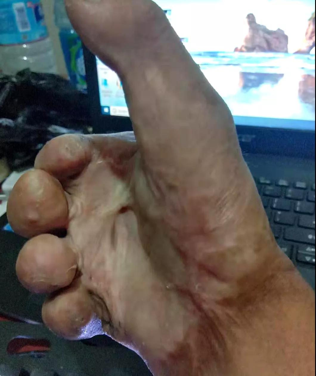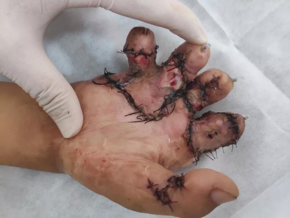 22岁的男性患者小戴(化名),2岁时右手烧伤导致完全丧失功能。当得知我院手外科技术精湛的消息后,他千里迢迢赶来。经检查,小戴右手2-5指末节缺损,手指屈曲挛缩,伸指受限,不能抓握。只有实施手术治疗,才能重塑手部功能。