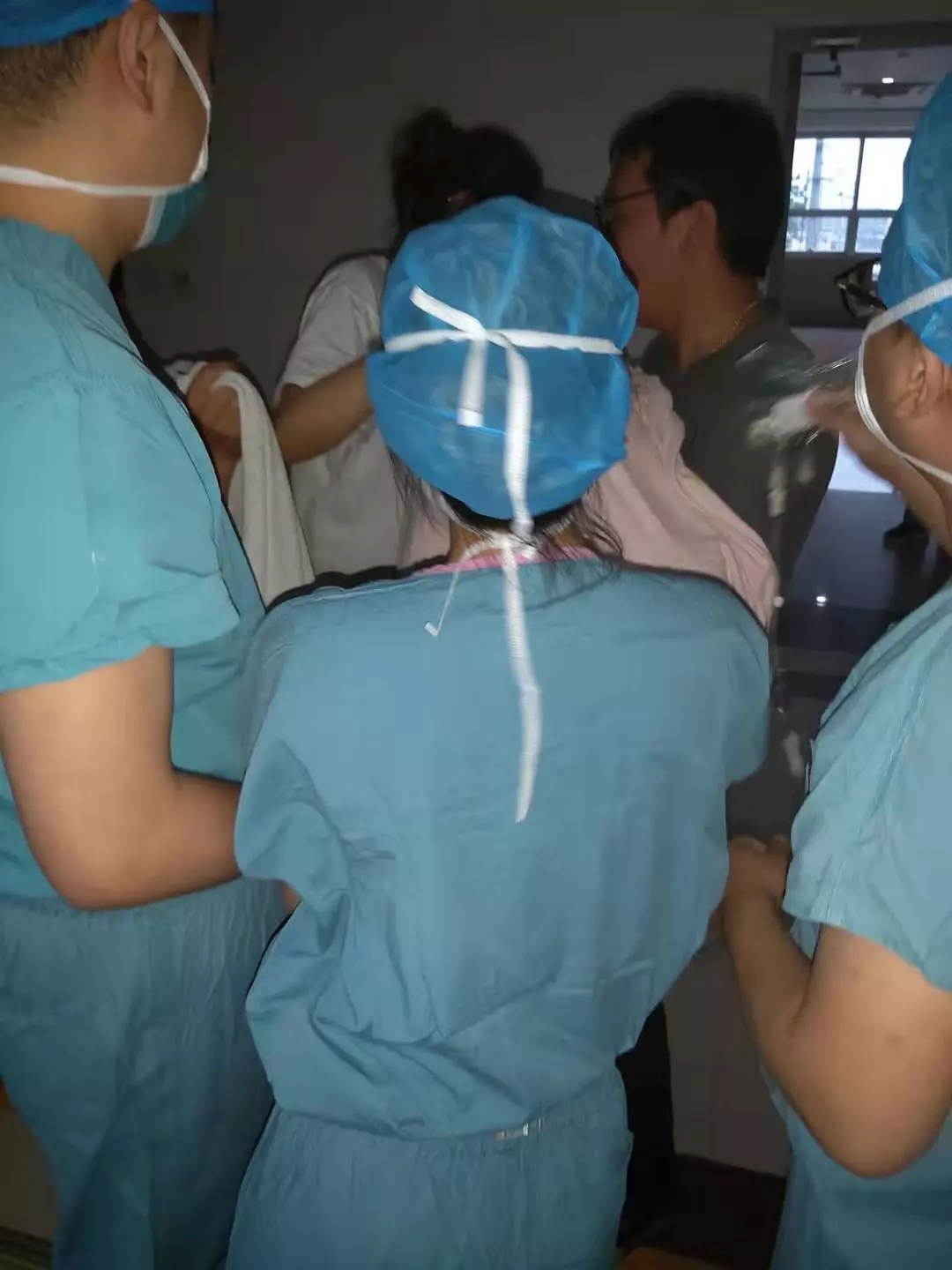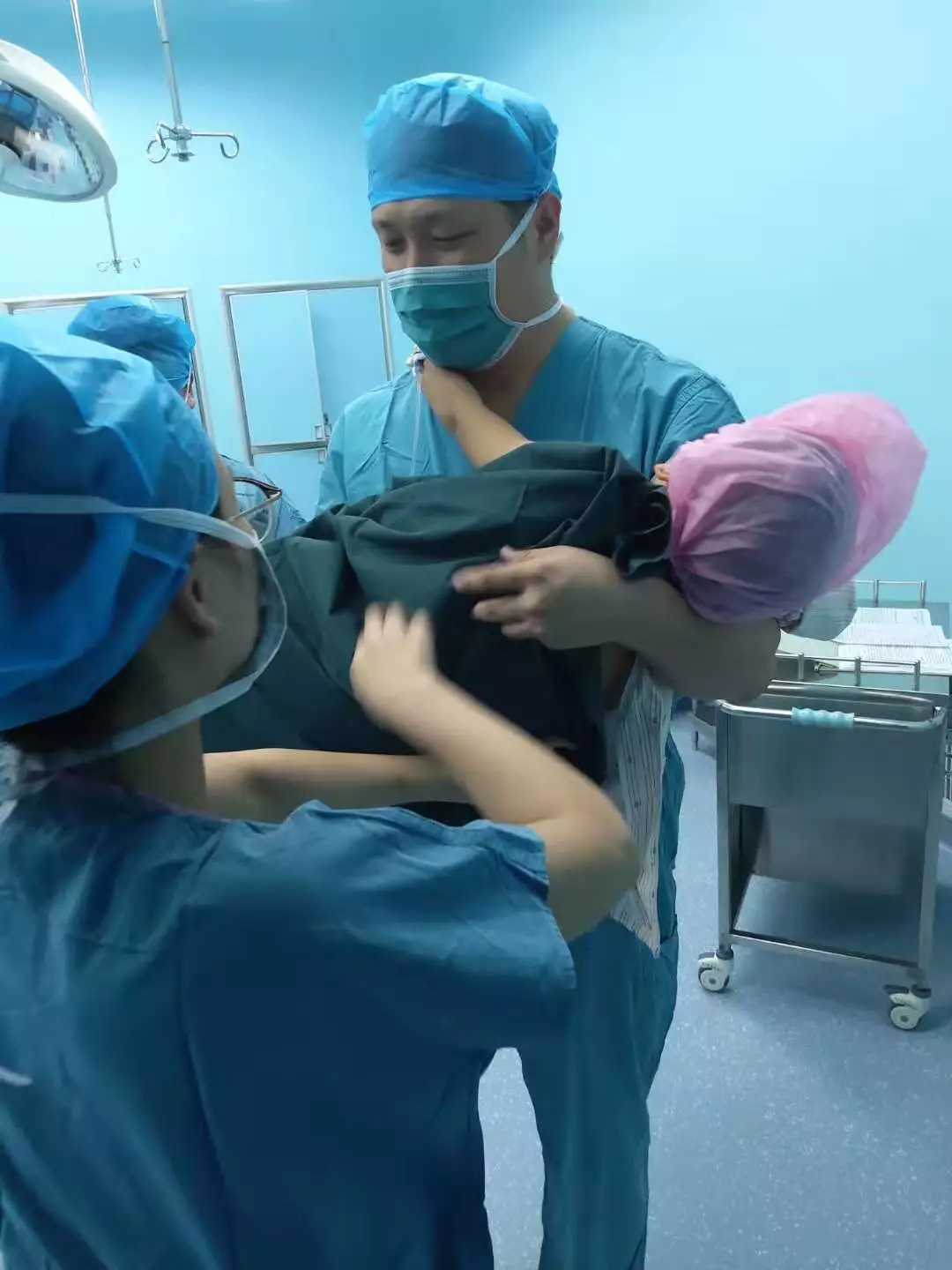 术后医护人员一起抱着凯凯交给手术外焦急等待凯凯的爸爸妈妈。