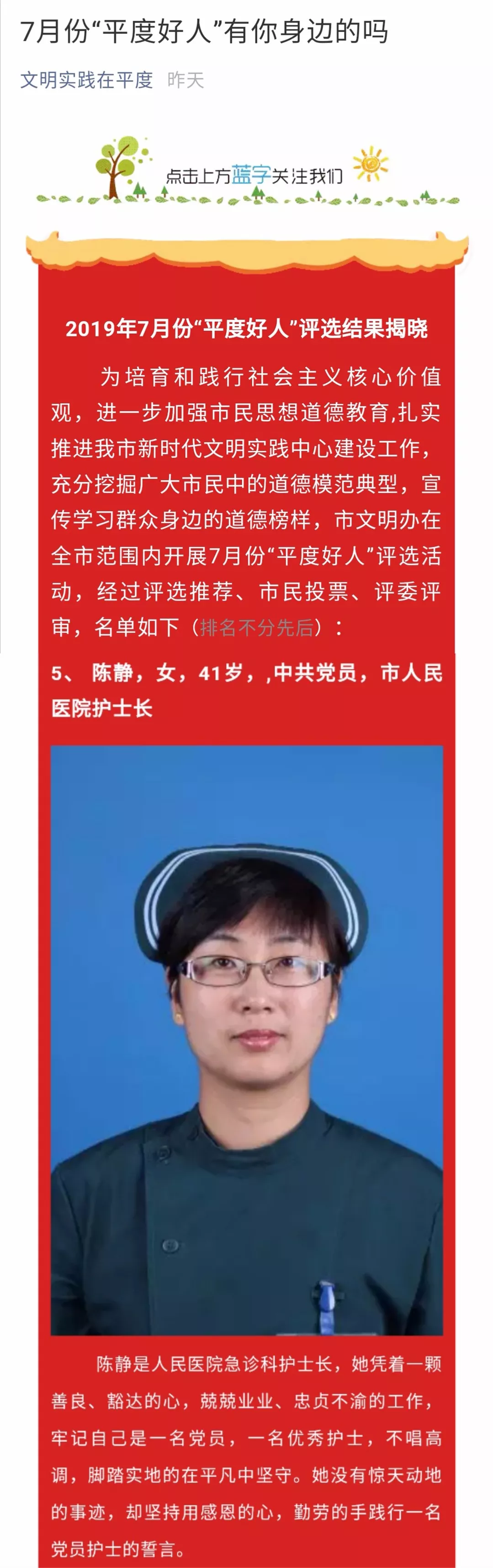 日前,市文明办公布了2019年7月份“平度好人”评选结果,我院急诊科护士长陈静成功获评。
