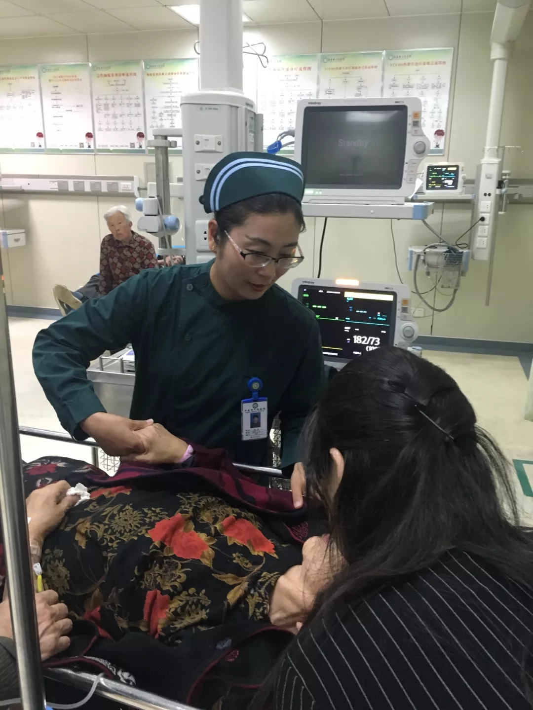 她顾大家,舍小家,有一年儿童流感、手足口病高发,急诊科输液大厅人满为患,每天情景用“只能看到绿色的衣帽,看不到护士的容貌”来形容一点也不过,只有加班加点才能缓解当时的输液压力,她的儿子那年4岁,同样没有幸免,体温三十九度八、四十度高烧不退,她没有时间陪伴孩子,只是叮嘱家人怎样给孩子吃药,怎样降温,连续三天公婆待不住了,把孩子带到了医院。在看到当时急诊输液大厅的情景时,本该埋怨的话没有出口,只是告知孩子的病情没有好转。她看着输液的长队和等待输液的家属焦急与期盼的眼神,她选择了留下,让公婆自己带着孩子到门诊看病,直到下班回家。孩子的一声“妈妈”,抱着她的脖子久久不撒手,她笑着抱着孩子,愧疚的泪水偷偷在孩子的衣服上蹭掉。