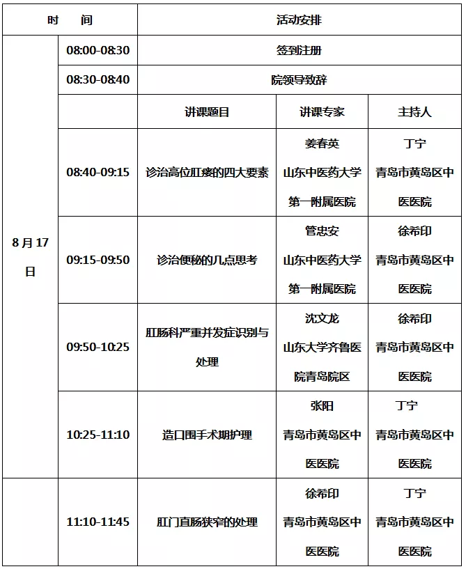 由青岛西海岸新区中医医院主办的省级中医药继续教育项目(编号2019080)“肛肠病临床规范培训班”定于2019年8月17日在青岛西海岸新区中医医院召开。届时将邀请山东省中医药大学第一附属医院姜春英教授、山东省中医药大学第一附属医院管忠安教授、山东大学齐鲁医院青岛院区肛肠外科主任沈文龙教授、青岛西海岸新区中医医院护理部主任张阳教授、青岛西海岸新区中医医院肛肠科主任徐希印教授等进行专题讲座。现将有关事宜通知如下。