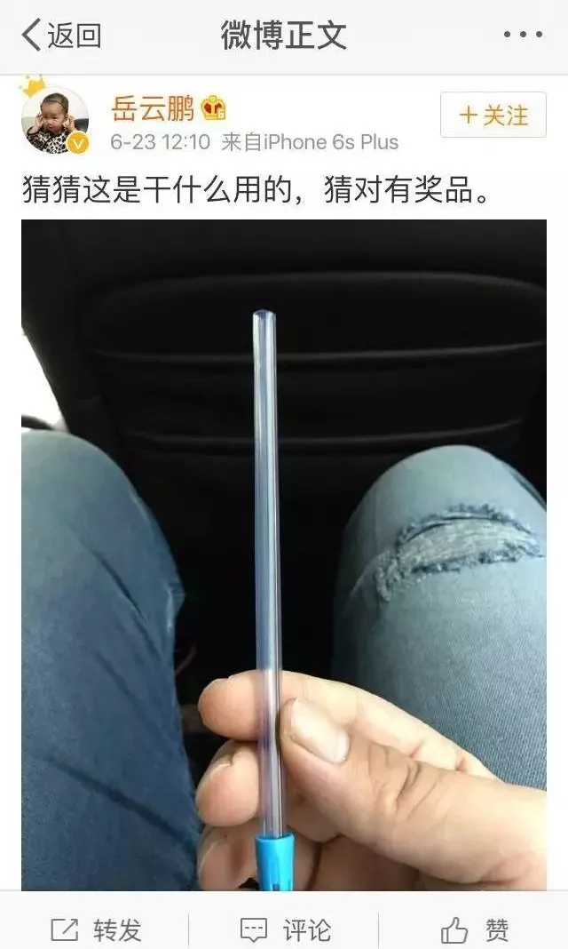 图上是一个神秘透明的棒状物体,评论立马炸了锅,有的网友说是体温计,有的说是吸管,甚至还有网友说是放粉刺针的、装铅笔芯的......反正说啥的都有,连小岳岳也对网友们的脑洞惊呼“我的天哪”!