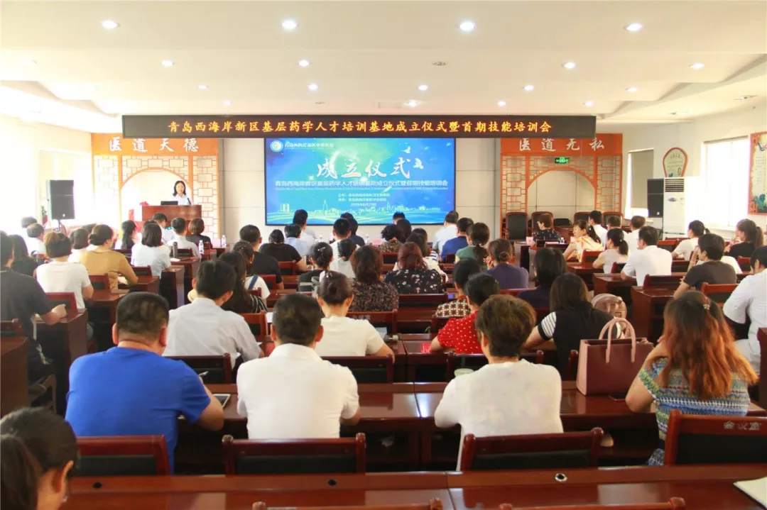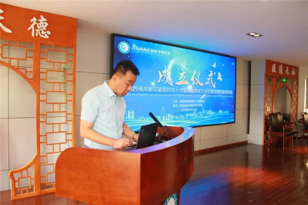 8月21日,青岛西海岸新区基层药学人才培训基地成立仪式暨首期技能培训会在青岛西海岸新区中心医院召开,市卫健委医政医管药政处张充力处长、区卫健局二级调研员刘守田、区卫健局医政医管药政科负责人郭常战、区中心医院领导班子出席基地成立仪式。会议由区中心医院总药师杨晓秋主持,全区各医疗机构药学人员共120余人参加。