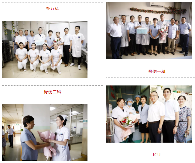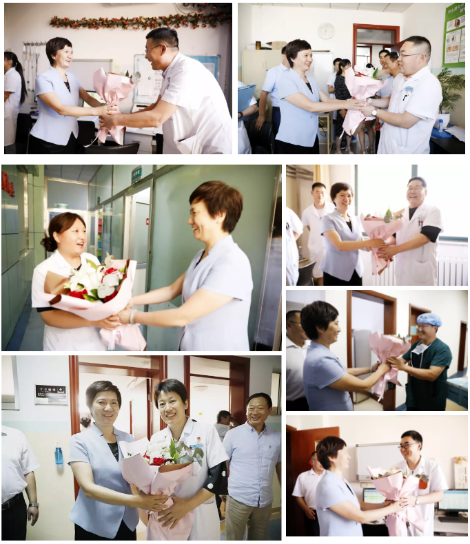 医院领导班子为医生送上鲜花合影留念,感谢他们坚守在救死扶伤岗位上的无私奉献,希望他们不断提升业务能力和技术水平,传承救死扶伤的医者誓言!