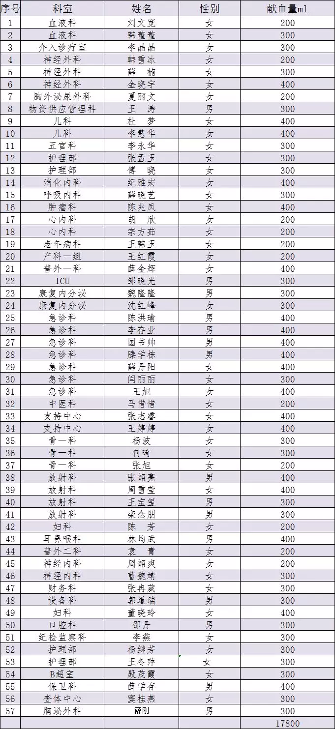 本次献血活动,共有57名“献血达人”献血,献血量为17800毫升。区中心医院员工以实际行动履行着一个公民的光荣义务,用温暖与爱诠释着医者父母心的高尚情怀,弘扬了医院“仁心医术 关爱生命”的核心价值观和人道主义精神。
