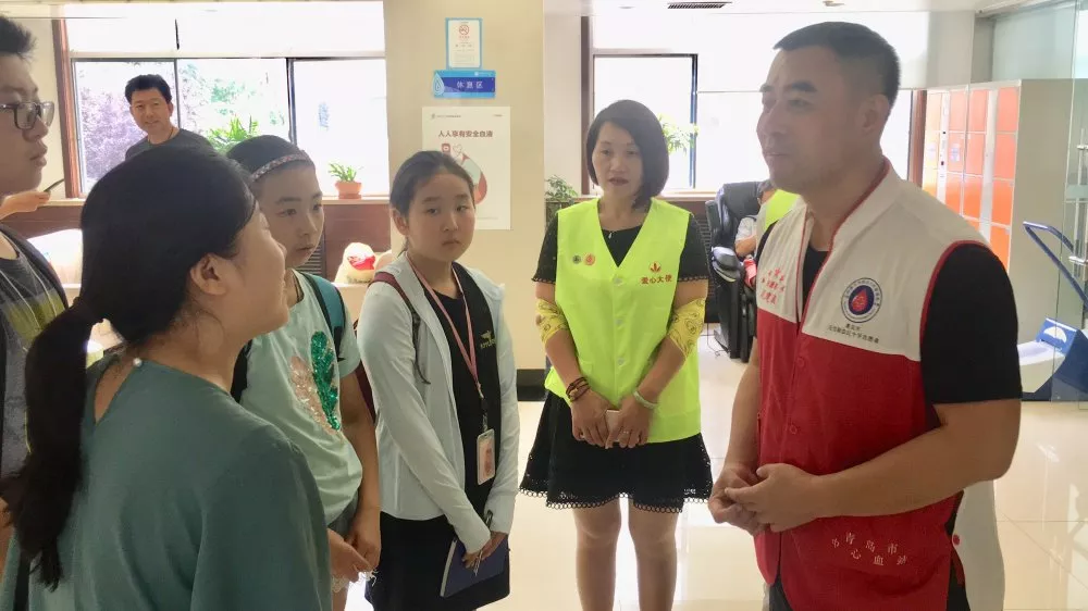 参观之后我们半岛都市报的小记者们来到了献血大厅对献血者热情的进行了小小的采访,被采访的是我们无偿献血者迟建波先生,他是青岛市即墨区尚德无偿献血志愿服务队队长,1999年开始献血,献血量3万多毫升,曾四次获得全国无偿献血奉献奖金奖,迟队长在采访谈话中非常真挚而热情。