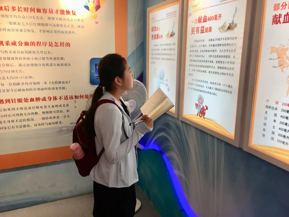 同学们积极参与着“相约科普,爱满暑期”暑期无偿献血公益实践,深入了解无偿献血健康知识,在科普基地里边学习无偿献血知识边认真做着笔记。