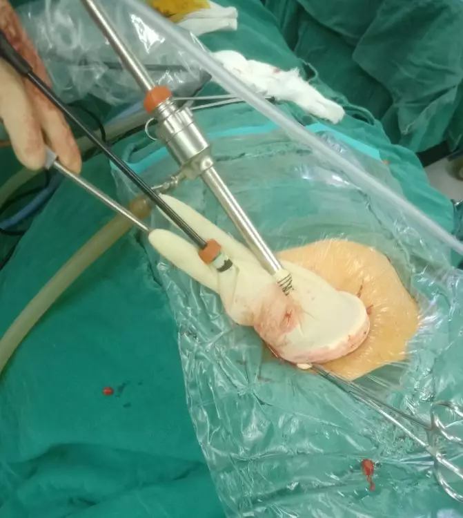 在小编与胡医生的采访中,令小编印象最深刻还是这只为患者足足省掉2000余元的医用手套。一个常见且便宜的医用手套,通过胡医生的改造竟变成了足足为患者省去了2000余元的单孔腹腔镜操作通道!
