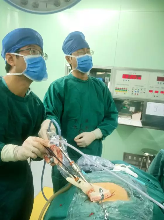 2019年8月19日,泌尿外科的胡乃刚主治医师、杨杰主治医师,正通过一个特殊的单孔腹腔镜操作通道,为一名患者进行单孔腹腔镜手术……