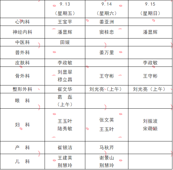 中秋节假期期间,我院各科室门诊安排如下,各医技科室正常开展各项检查,特此告知。
