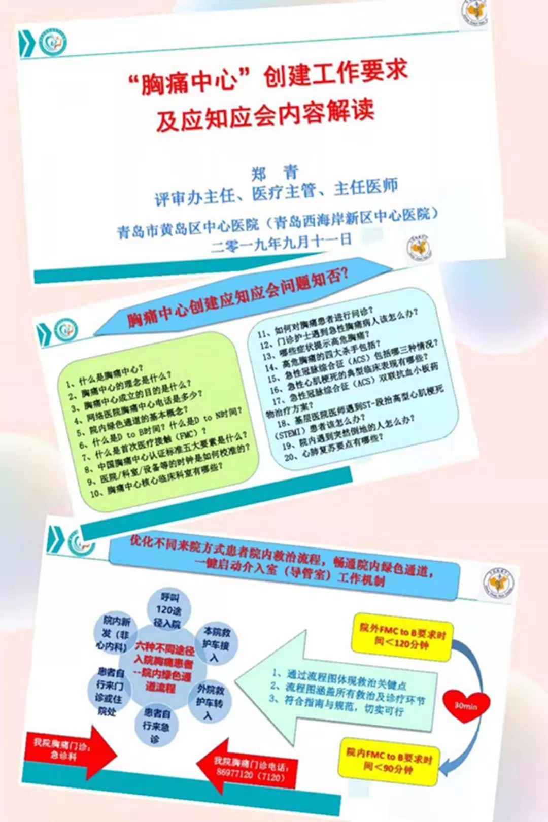 区中心医院评审办主任、医疗主管、主任医师郑青主任对“胸痛中心”创建工作要求以及应知应会内容进行了解读,重点强调了中国胸痛中心认证标准的五大要素、中国胸痛中心建设要求、目前医院创建“胸痛中心”工作进程、省级预审专家现场督查反馈问题及创建工作,并对胸痛中心、首次医疗接触、院内绿色通道概念,D to B时间、D to N时间概念,医院胸痛门诊地点、联系方式、主要诊疗流程及标识等胸痛中心创建应知应会内容进行了解读。