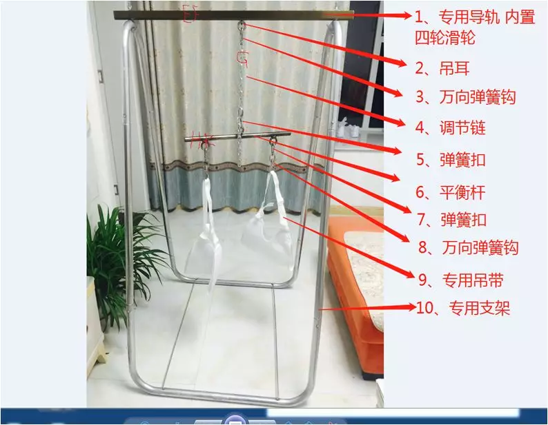 防止褥疮,可将该设备固定在小腹部上方。让患者佩戴棉皮护腰,护腰上有挂钩,挂在手握环上,调整好高度,用力将患者臀部乃至腰部吊起。每日上下午各1次,每次半小时。这样可以避免或减轻臀部及背部皮肤压迫,防止褥疮发生。患者排便时,也可如此操作,方便排便,减少家人陪护的麻烦。